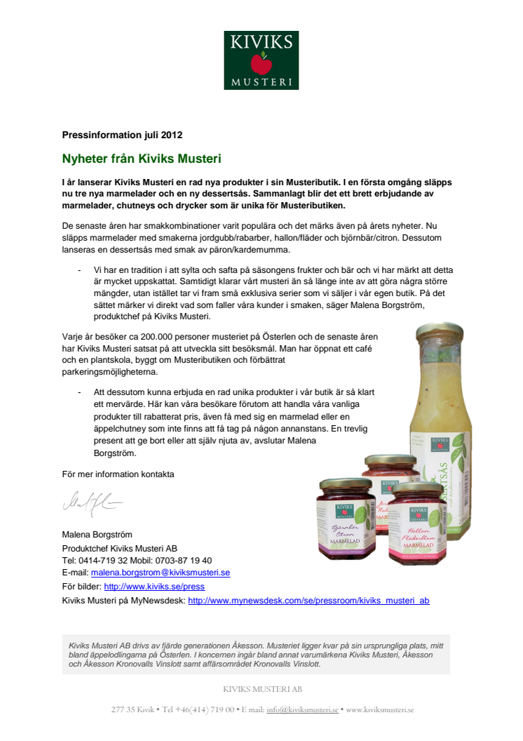 I år lanserar Kiviks Musteri en rad nya produkter i sin Musteributik. I en första omgång släpps nu tre nya marmelader och en ny dessertsås. Sammanlagt blir det ett brett erbjudande av marmelader, chutneys och drycker som är unika för Musteributiken.