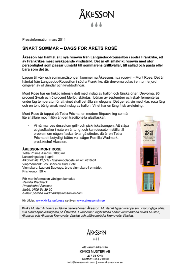 Åkesson har hämtat sitt nya rosévin från Languedoc-Roussillon i södra Frankrike, ett av Frankrikes mest nyskapande vindistrikt. Det är ett smakrikt rosévin med stor personlighet som passar utmärkt till sommarens grillkvällar, till sallad och pasta eller bara som det är.