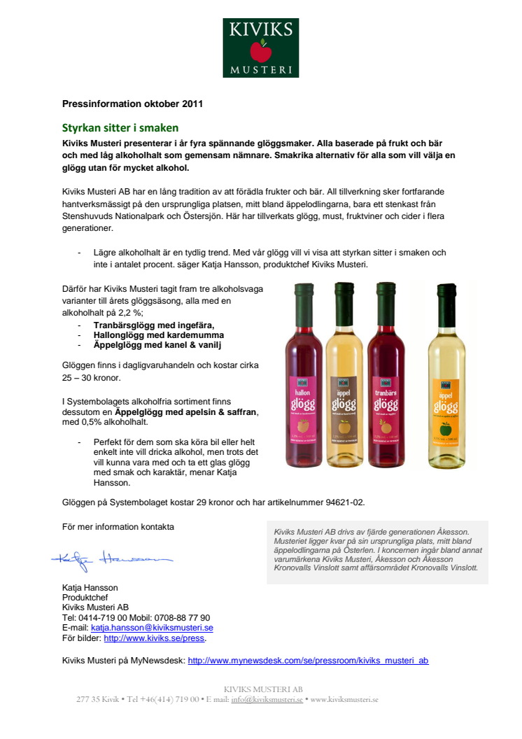 Kiviks Musteri presenterar i år fyra spännande glöggsmaker. Alla baserade på frukt och bär och med låg alkoholhalt som gemensam nämnare. Smakrika alternativ för alla som vill välja en glögg utan för mycket alkohol.