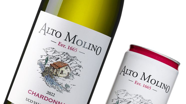 Alto Molino Chardonnay 2022 på flaska och burk.