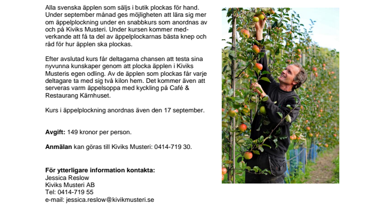 Lördagen den 10 september hålls en kurs i äppelplockning på Kiviks Musteri. Efteråt får deltagarna möjlighet att plocka äpplen i Kiviks Musteris egen odling. Det kommer även att bjudas på god äppel- & kycklingsoppa.