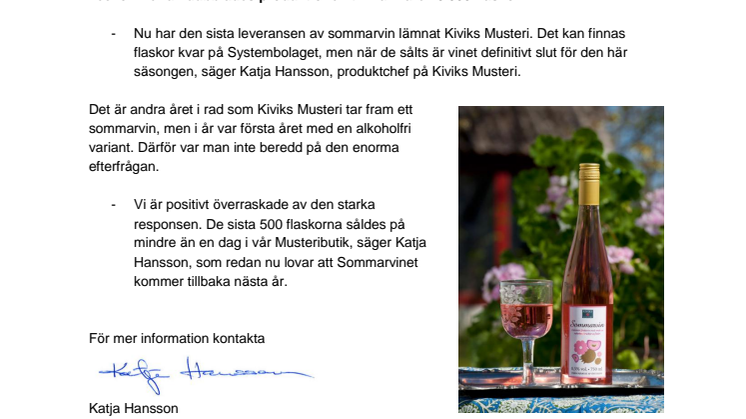 - Nu har den sista leveransen av sommarvin lämnat Kiviks Musteri. Det kan finnas flaskor kvar på Systembolaget, men när de sålts är vinet definitivt slut för den här säsongen, säger Katja Hansson, produktchef på Kiviks Musteri.