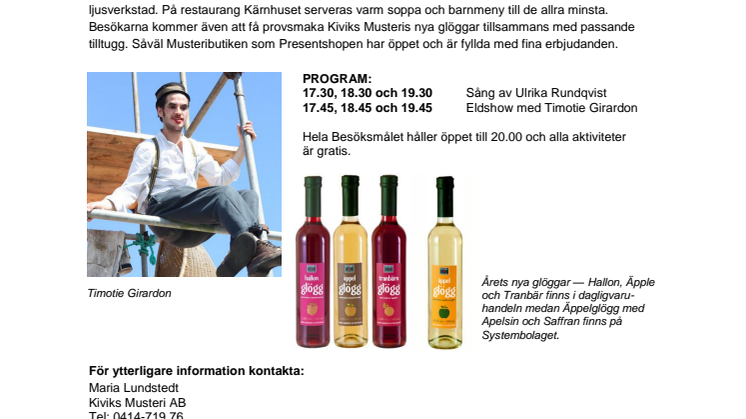 En sprakande eldshow med Timotie Girardon och stämningsfull sång av Ulrika Rundqvist är två av programpunkterna när Kiviks Musteri är med och firar Österlen Lyser nu på fredag.