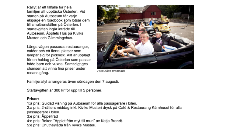 Nu på torsdag den 14 juli är det dags för familjerally. Start mellan klockan 10 och 11 från Autoseum i Simrishamn. Därifrån bär det av på Österlens slingrande småvägar. En rad spännande aktiviteter längs vägen gör att familjerallyt passar alla åldrar.