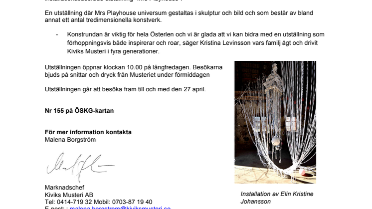 I samarbete med Konstrundan på Österlen visar Kiviks Musteri, med start på långfredagen, hennes installationsbaserade utställning ”Mrs Playhouse”.