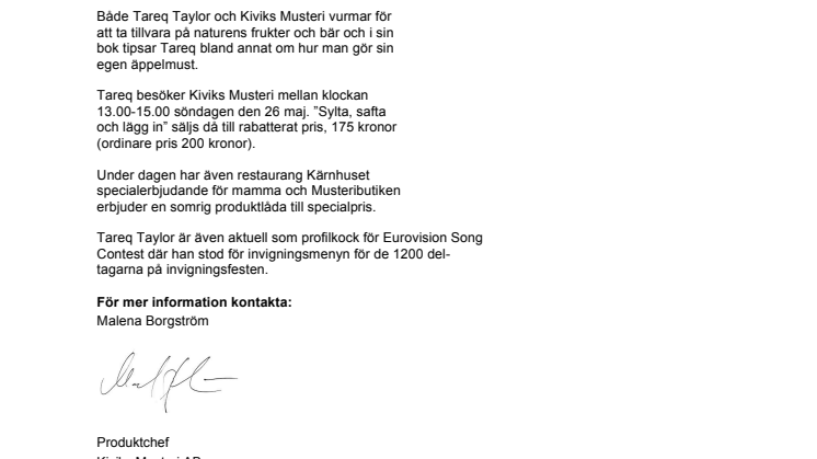 Tareq besöker Kiviks Musteri mellan klockan 13.00-15.00 söndagen den 26 maj. ”Sylta, safta och lägg in” säljs då till rabatterat pris, 175 kronor (ordinare pris 200 kronor).