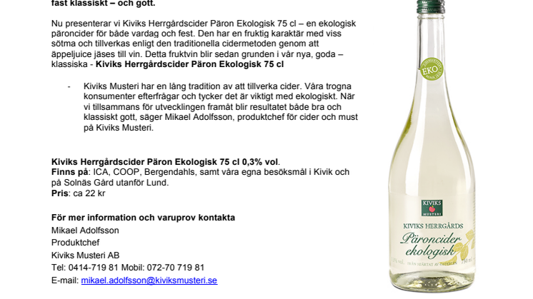 - Kiviks Musteri har en lång tradition av att tillverka cider. Våra trogna konsumenter efterfrågar och tycker det är viktigt med ekologiskt. När vi tillsammans för utvecklingen framåt blir resultatet både bra och klassiskt gott, säger Mikael Adolfsson, produktchef för cider och must på Kiviks Musteri.