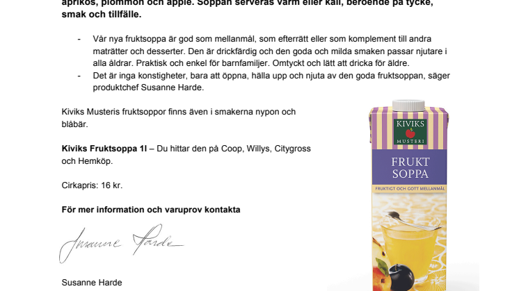 - Vår nya fruktsoppa är god som mellanmål, som efterrätt eller som komplement till andra maträtter och desserter. Den är drickfärdig och den goda och milda smaken passar njutare i alla åldrar. Praktisk och enkel för barnfamiljer. Omtyckt och lätt att dricka för äldre.