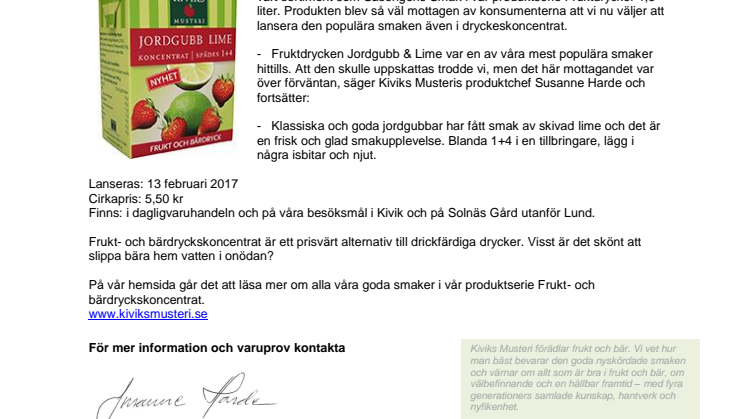 Våren 2016 var smakkombinationen jordgubb & lime på tillfälligt besök i vårt sortiment som Säsongens Smak i vår produktserie Fruktdrycker 1,5 liter. Produkten blev så väl mottagen av konsumenterna att vi nu väljer att lansera den populära smaken även i dryckeskoncentrat.