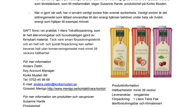 - Vår nya saft är gjord på naturliga råvaror. Den finns i tre riktigt goda smaker och passar lika bra som törstsläckare, som till mellanmålet, säger Susanne Harde, produktchef på Kiviks Musteri.