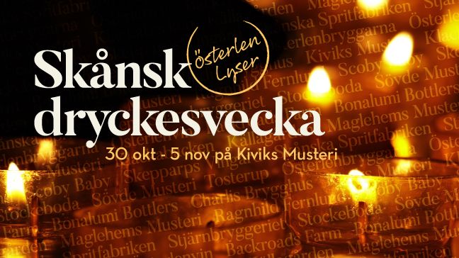 Från 30/10 till och med 5/11, bjuder Kiviks Musteri in till Skånsk dryckesvecka som avslutas med Österlen lyser. Syftet med veckan är att lyfta den mångfald som skånska dryckesproducenter har.