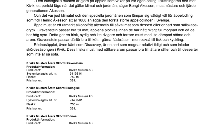 - Den ekologiska musten är gjord på äpplen som växer på vår egen odling i sluttningarna ned mot Kivik, ett perfekt läge när det gäller klimat och jordmån, säger Bengt Åkesson, mustmästare och fjärde generationen Åkesson.