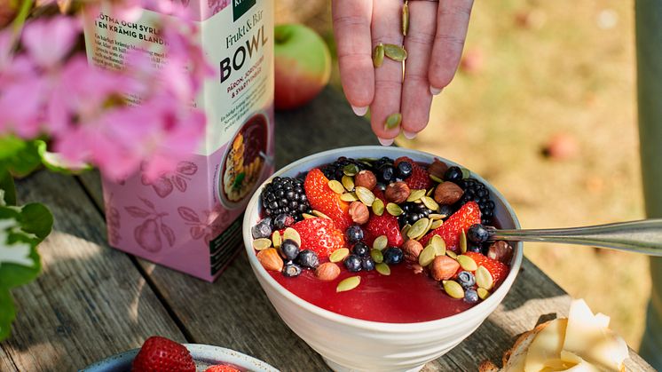 - Frukt och Bär Bowl är ett hållbart alternativ och hälsosam produkt, med det höga fruktinnehållet. Dessutom är det ett enkelt sätt att äta sin frukost eller sitt mellanmål; det är klart att hällas upp i en skål och toppa med precis vad du vill. Varför inte lite fröer, nötter, kokos, jordnötssmör, din favoritmüsli eller kanske lite extra bär? Eller häll på din gröt eller yoghurt. Testa dig fram och hitta din perfekta kombination, säger produktchef Jessika Karlsson.