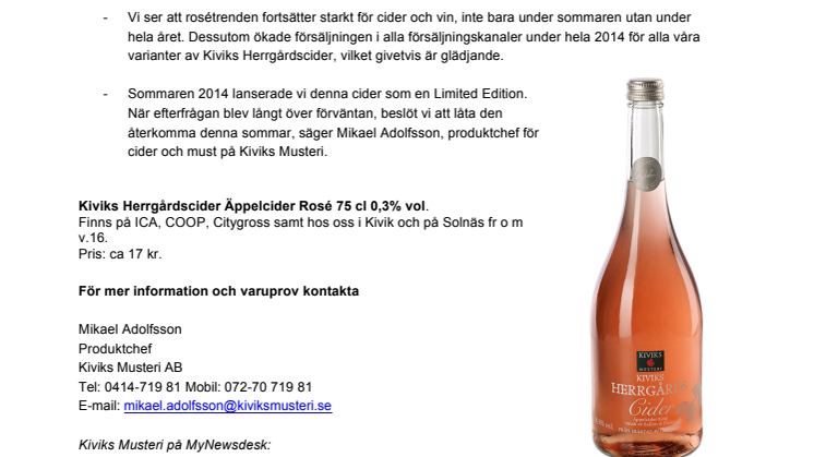 - Sommaren 2014 lanserade vi denna cider som en Limited Edition. När efterfrågan blev långt över förväntan, beslöt vi att låta den återkomma denna sommar, säger Mikael Adolfsson, produktchef för cider och must på Kiviks Musteri.