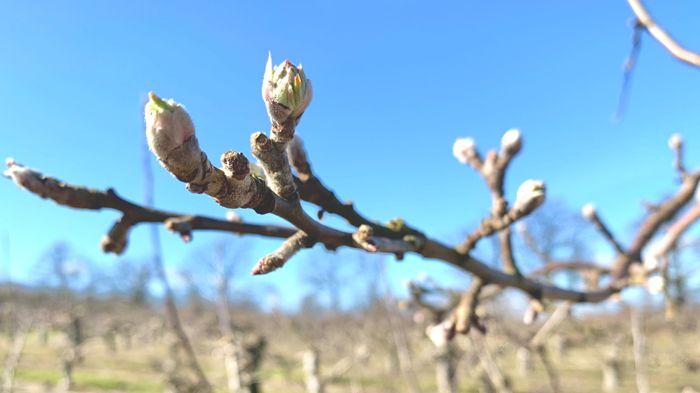 På Kiviks Musteri arbetar man just nu med att beskära de sista äppelträden och kan notera en tidig knoppning av träden.