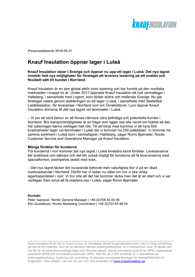 Knauf Insulation växer i Sverige och öppnar nu upp ett lager i Luleå. Det nya lagret innebär helt nya möjligheter för företaget att leverera isolering på ett snabbt och flexibelt sätt till kunder i Norrland.