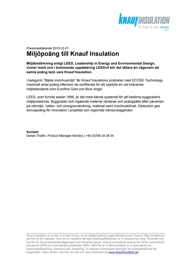 in Energy and Environmental Design, vinner mark och i kommande uppdatering LEEDv4 blir det lättare än någonsin att samla poäng tack vare Knauf Insulation.
