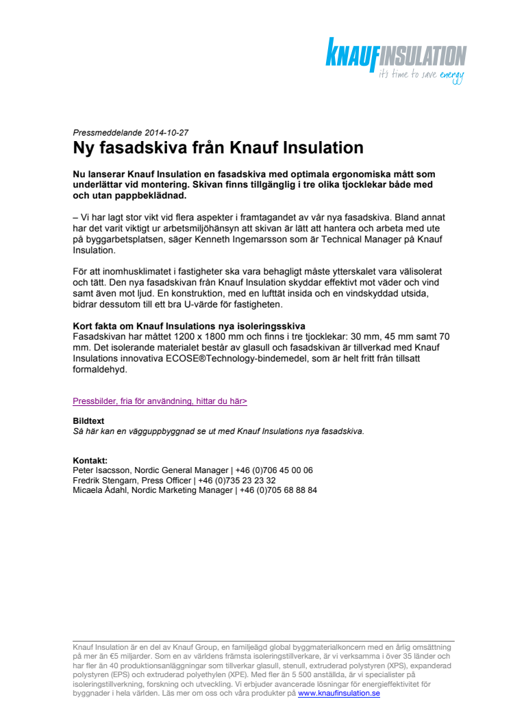 Nu lanserar Knauf Insulation en fasadskiva med optimala ergonomiska mått som underlättar vid montering. Skivan finns tillgänglig i tre olika tjocklekar både med och utan pappbeklädnad.
