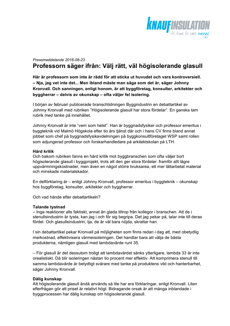 – Nja, jag vet inte det... Men ibland måste man säga som det är, säger Johnny Kronvall i en intervju med Knauf Insulation News. Och sanningen, enligt honom, är att byggföretag, konsulter, arkitekter och byggherrar – delvis av okunskap – ofta väljer fel isolering.