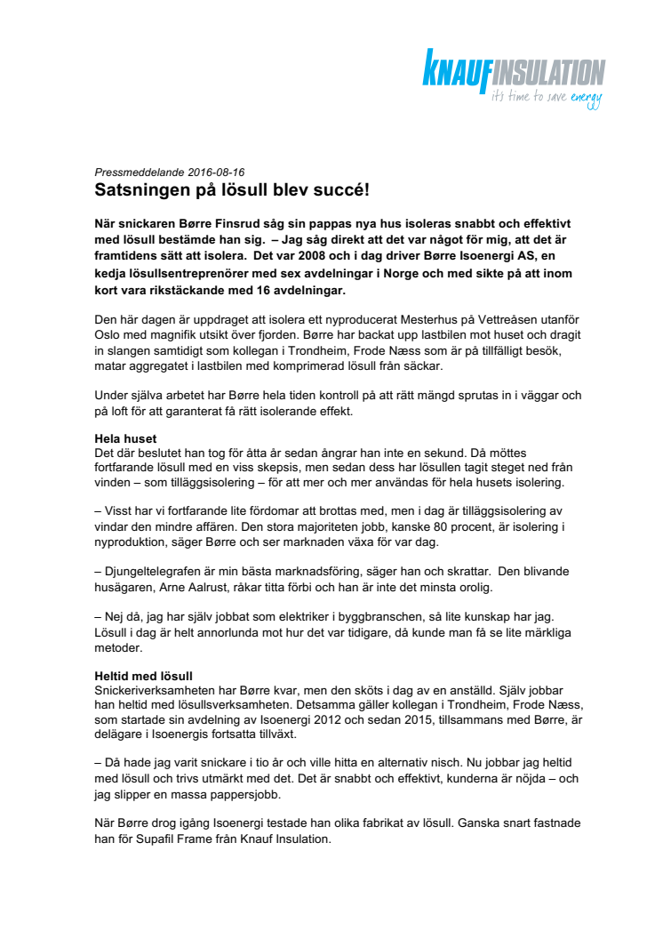 Reportage, fritt för publicering: När snickaren Børre Finsrud såg sin pappas nya hus isoleras snabbt och effektivt med lösull bestämde han sig. Det var 2008 och i dag driver Børre Isoenergi AS, en kedja lösullsentreprenörer med sex avdelningar i Norge och med sikte på att inom kort vara rikstäckande med 16 avdelningar.