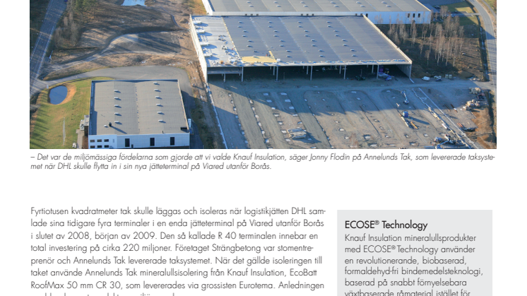 Fyrtiotusen kvadratmeter tak skulle läggas och isoleras när logistikjätten DHL samlade sina tidigare fyra terminaler i en enda jätteterminal på Viared utanför Borås i slutet av 2008, början av 2009. Den så kallade R 40 terminalen innebar en total investering på cirka 220 miljoner. Företaget Strängbetong var stomentreprenör och Annelunds Tak levererade taksystemet. När det gällde isoleringen till taket använde Annelunds Tak mineralullsisolering från Knauf Insulation, EcoBatt RoofMax 50 mm CR 30, som levererades via grossisten Eurotema. Anledningen var bland annat produktens miljöegenskaper.