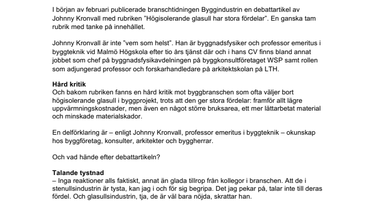 I början av februari publicerade branschtidningen Byggindustrin en debattartikel av Johnny Kronvall med rubriken ”Högisolerande glasull har stora fördelar”. En ganska tam rubrik med tanke på innehållet.