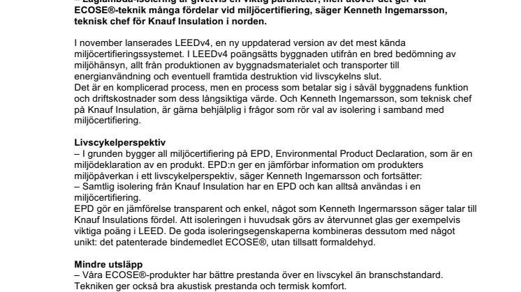 – Samtlig isolering från Knauf Insulation har en EPD och kan alltså användas i en miljöcertifiering.