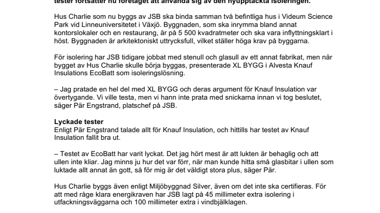 För byggnationen av Hus Charlie i Växjö, en 5500 kvadratmeter stor byggnad som ska rymma kontorslokaler och en restaurang, använder bygg- och projektutvecklingsbolaget JSB Knauf Insulations EcoBatt-isolering. Efter lyckade tester fortsätter nu företaget att använda sig av den nyupptäckta isoleringen.