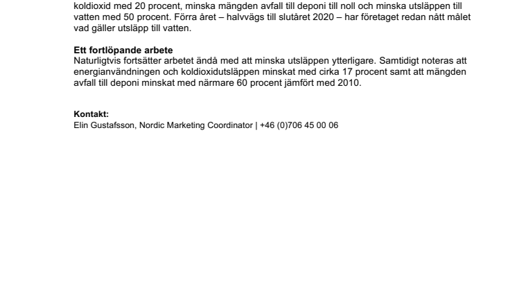 Naturligtvis fortsätter arbetet ändå med att minska utsläppen ytterligare. Samtidigt noteras att energianvändningen och koldioxidutsläppen minskat med cirka 17 procent samt att mängden avfall till deponi minskat med närmare 60 procent jämfört med 2010.