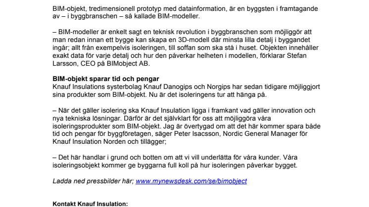 – När det gäller isolering ska Knauf Insulation ligga i framkant vad gäller innovation och nya tekniska lösningar. Därför är det självklart för oss att möjliggöra våra isoleringsprodukter som BIM-objekt. Jag är övertygad om att det här kommer spara både tid och pengar för byggföretagen, säger Peter Isacsson, Nordic General Manager för Knauf Insulation Norden och tillägger;