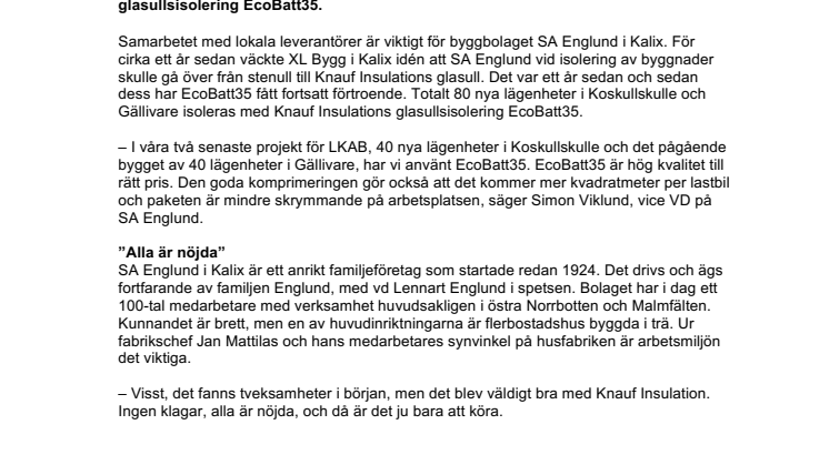 Samarbetet med lokala leverantörer är viktigt för byggbolaget SA Englund i Kalix. För cirka ett år sedan väckte XL Bygg i Kalix idén att SA Englund vid isolering av byggnader skulle gå över från stenull till Knauf Insulations glasull. Det var ett år sedan och sedan dess har EcoBatt35 fått fortsatt förtroende. Totalt 80 nya lägenheter i Koskullskulle och Gällivare isoleras med Knauf Insulations glasullsisolering EcoBatt35.