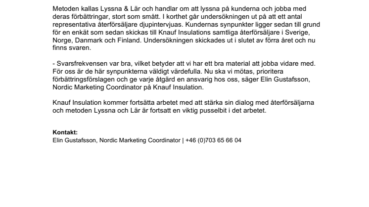 Metoden kallas Lyssna & Lär och handlar om att lyssna på kunderna och jobba med deras förbättringar, stort som smått. I korthet går undersökningen ut på att ett antal representativa återförsäljare djupintervjuas. Kundernas synpunkter ligger sedan till grund för en enkät som sedan skickas till Knauf Insulations samtliga återförsäljare i Sverige, Norge, Danmark och Finland. Undersökningen skickades ut i slutet av förra året och nu finns svaren.