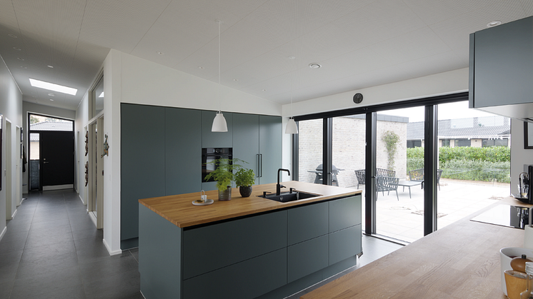 ”När skivorna är monterade är taket färdigt. Det är en mycket enkel process. Skivorna är lätta att hantera och skära till eftersom det är gips. Det är dessutom ett stort plus att skivorna inte kräver acklimatisering och därför kan skruvas upp direkt. Resultatet blir ett snyggt och ljust tak med akustik och diskret utseende.” /Stefan Danielsen, snickare.
