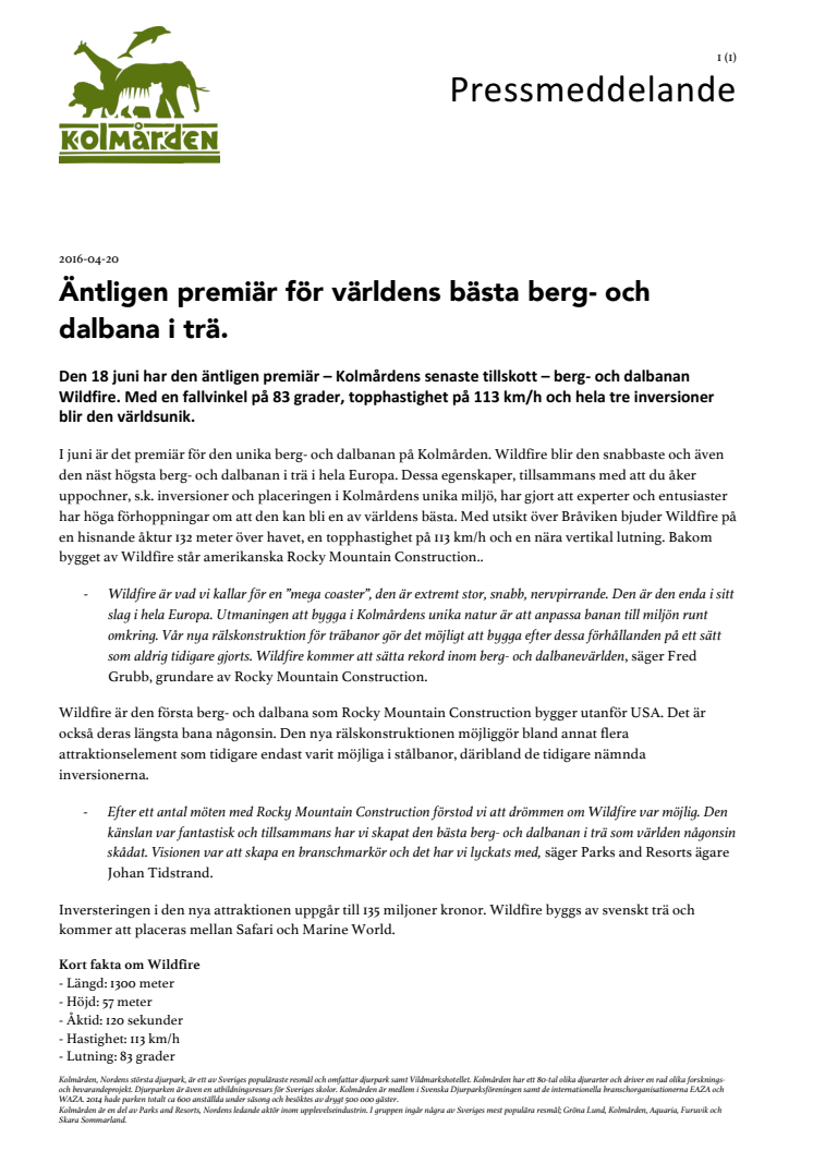 Den 18 juni har den äntligen premiär – Kolmårdens senaste tillskott – berg- och dalbanan Wildfire. Med en fallvinkel på 83 grader, topphastighet på 113 km/h och hela tre inversioner blir den världsunik.