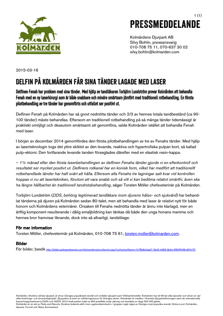 Delfinen Fenah har problem med sina tänder. Med hjälp av tandläkaren Torbjörn Lundström provar Kolmården att behandla Fenah med en ny laserkirurgi som är både snabbare och mindre smärtsam jämfört med traditionell rotbehandling. En första pilotbehandling av tre tänder har genomförts och utfallet ser positivt ut.