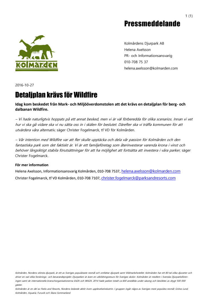 Idag kom beskedet från Mark- och Miljööverdomstolen att det krävs en detaljplan för berg- och dalbanan Wildfire.