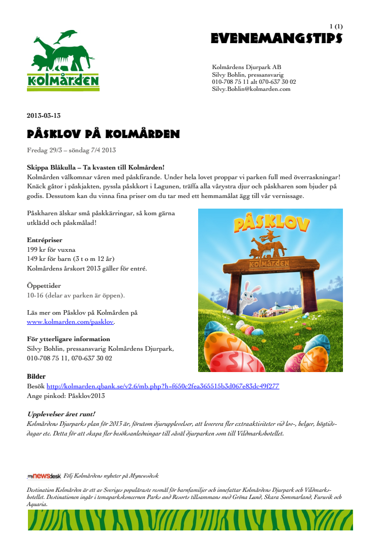 Kolmården välkomnar våren med påskfirande.Under hela lovet proppar vi parken full med överraskningar! Knäck gåtor i påskjakten, pyssla påskkort i Lagunen, träffa alla vårystra djur och påskharen som bjuder på godis. Dessutom kan du vinna fina priser om du tar med ett hemmamålat ägg till vår vernissage.