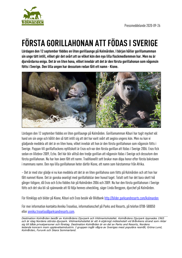 Lördagen den 12 september föddes en liten gorillaunge på Kolmården. I början håller gorillamamman sin unge tätt intill, vilket gör det svårt att se vilket kön den nya lilla flockmedlemmen har. Men nu är djurvårdarna eniga. Det är en liten hona, vilket innebär att det är den första gorillahonan som någonsin fötts i Sverige. Den lilla ungen har dessutom redan fått ett namn - Kione.