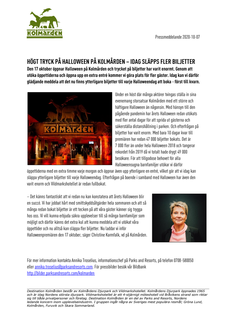 Den 17 oktober öppnar Halloween på Kolmården och trycket på biljetter har varit enormt. Genom att utöka öppettiderna och öppna upp en extra entré kommer vi göra plats för fler gäster. Idag kan vi därför glädjande meddela att det nu finns ytterligare biljetter till varje Halloweendag att boka - först till kvarn.