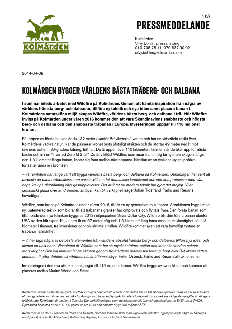 I sommar inleds arbetet med Wildfire på Kolmården. Genom att hämta inspiration från några av världens främsta berg- och dalbanor, tillföra ny teknik och nya idéer samt placera banan i Kolmårdens natursköna miljö skapas Wildfire, världens bästa berg- och dalbana i trä. När Wildfire invigs på Kolmården under våren 2016 kommer den att vara Skandinaviens snabbaste och högsta berg- och dalbana.