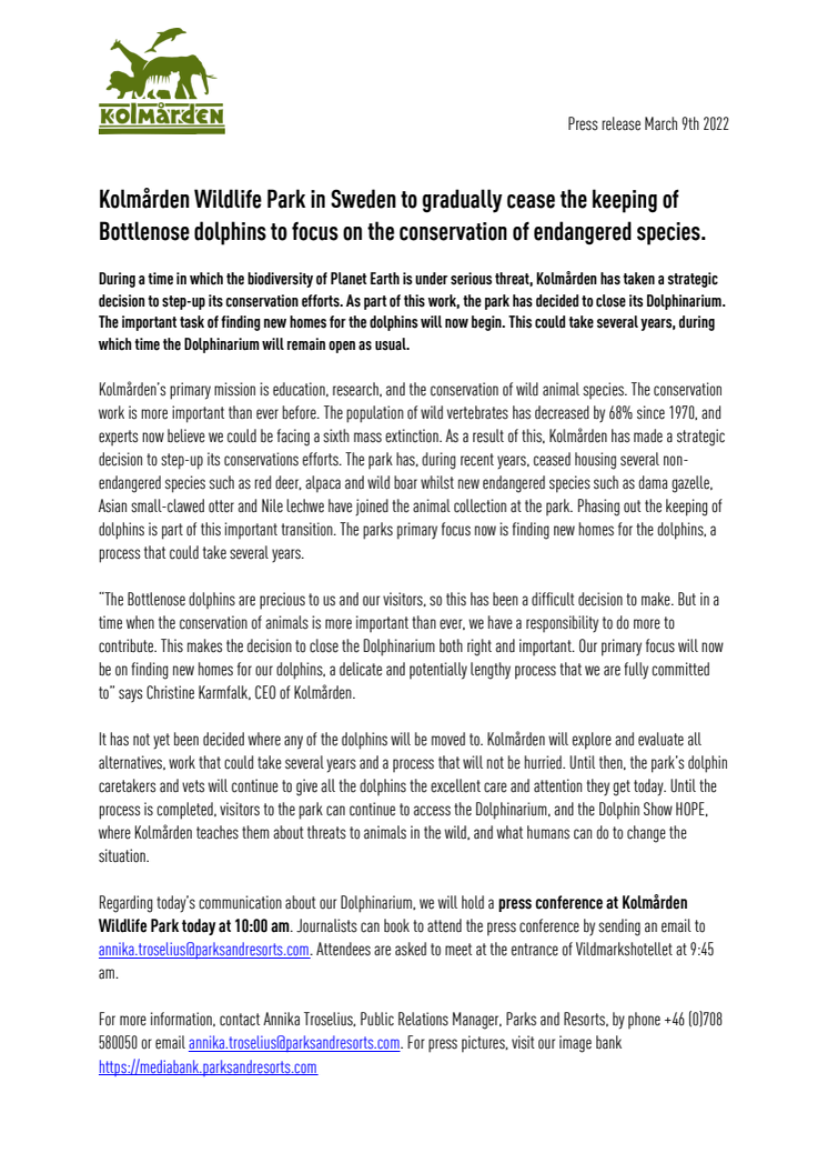 Kolmården Wildlife Park in Sweden to gradually cease the keeping of Bottlenose dolphins to focus on the conservation of endangered species.pdf