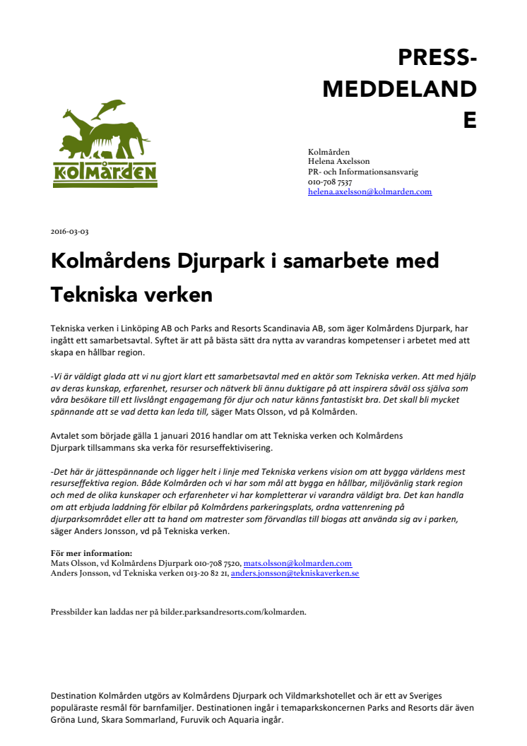 Tekniska verken i Linköping AB och Parks and Resorts Scandinavia AB, som äger Kolmårdens Djurpark, har ingått ett samarbetsavtal. Syftet är att på bästa sätt dra nytta av varandras kompetenser i arbetet med att skapa en hållbar region.