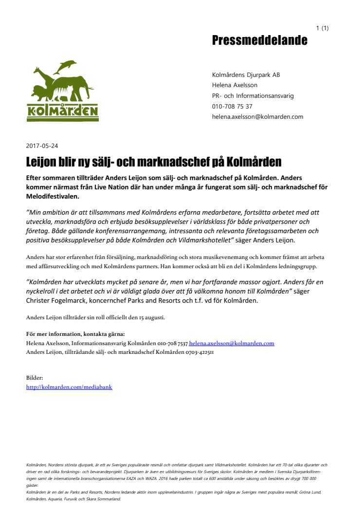 Efter sommaren tillträder Anders Leijon som sälj- och marknadschef på Kolmården. Anders kommer närmast från Live Nation där han under många år fungerat som sälj- och marknadschef för Melodifestivalen.