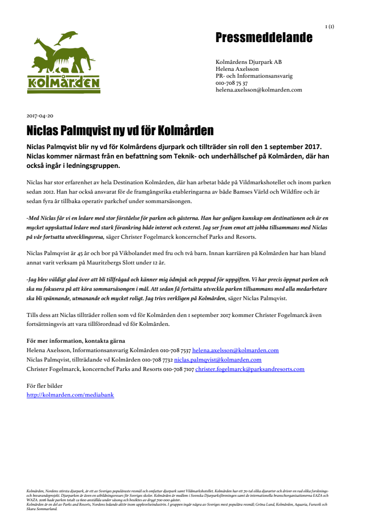 Niclas Palmqvist blir ny vd för Kolmårdens djurpark och tillträder sin roll den 1 september 2017. Niclas kommer närmast från en befattning som Teknik- och underhållschef på Kolmården, där han också ingår i ledningsgruppen.