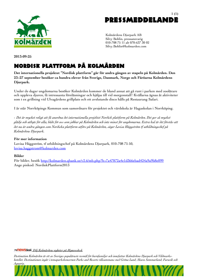 Det internationella projektet ”Nordisk plattform” går för andra gången av stapeln på Kolmården. Den 23–27 september besöker ca hundra elever från Sverige, Danmark, Norge och Färöarna Kolmårdens Djurpark.
