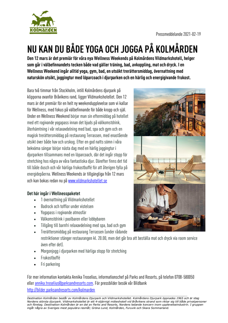 Den 12 mars är det premiär för våra nya Wellness Weekends på Kolmårdens Vildmarkshotell, helger som går i välbefinnandets tecken både vad gäller träning, bad, avkoppling, mat och dryck. I en Wellness Weekend ingår alltid yoga, gym, bad, en utsökt trerättersmiddag, övernattning med naturskön utsikt, joggingtur med löparcoach i djurparken och en härlig och energigivande frukost.