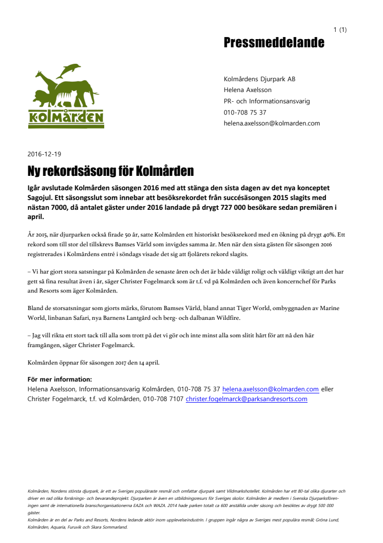 Igår avslutade Kolmården säsongen 2016 med att stänga den sista dagen av det nya konceptet Sagojul. Ett säsongsslut som innebar att besöksrekordet från succésäsongen 2015 slagits med nästan 7000, då antalet gäster under 2016 landade på drygt 727 000 besökare sedan premiären i april.