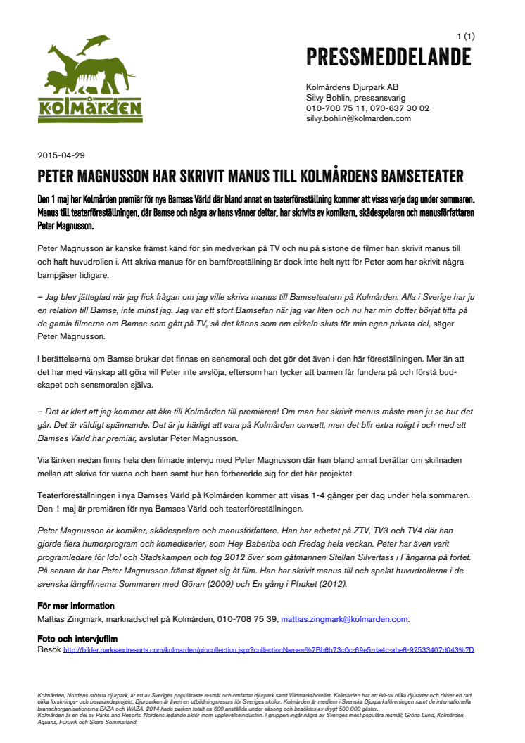 Den 1 maj har Kolmården premiär för nya Bamses Värld där bland annat en teaterföreställning kommer att visas varje dag under sommaren. Manus till teaterföreställningen, där Bamse och några av hans vänner deltar, har skrivits av komikern, skådespelaren och manusförfattaren Peter Magnusson.
