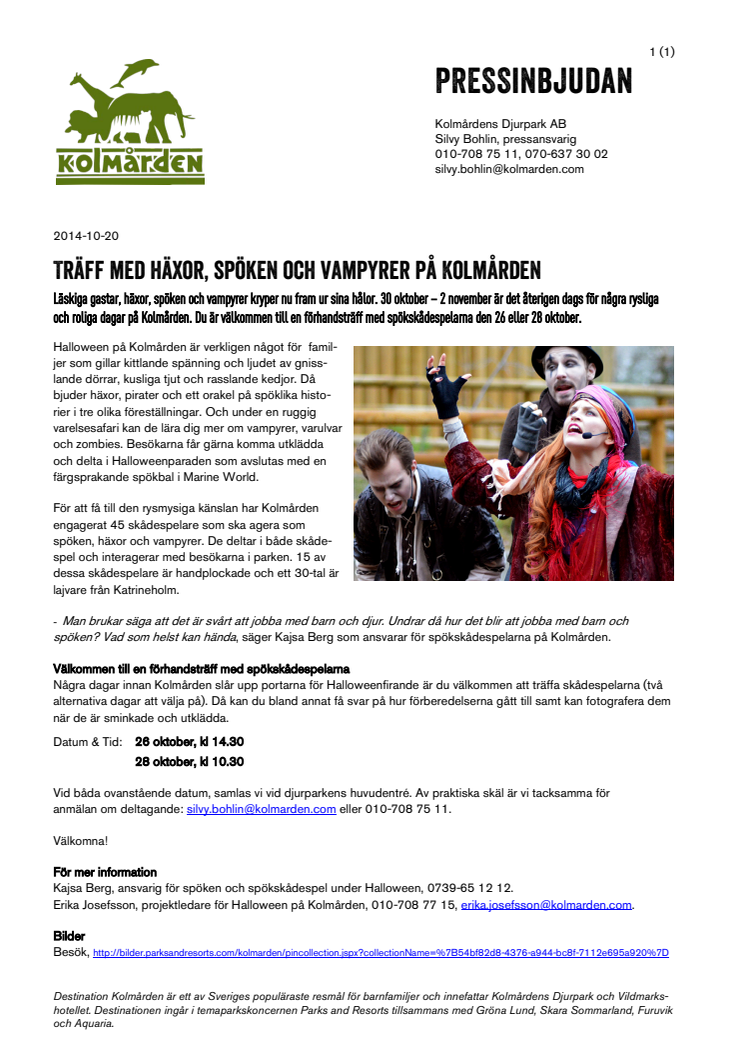 Läskiga gastar, häxor, spöken och vampyrer kryper nu fram ur sina hålor. 30 oktober – 2 november är det återigen dags för några rysliga och roliga dagar på Kolmården. Du är välkommen till en förhandsträff med spökskådespelarna den 26 eller 28 oktober.