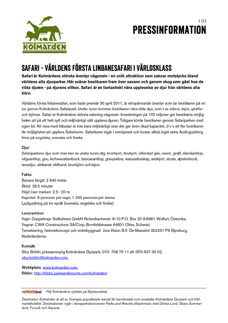 Safari är Kolmårdens största äventyr någonsin - en unik attraktion som saknar motstycke bland världens alla djurparker. Här svävar besökaren fram över savann och genom skog som gäst hos de vilda djuren - på djurens villkor. Safari är en fantastiskt nära upplevelse av djur från världens alla hörn.
